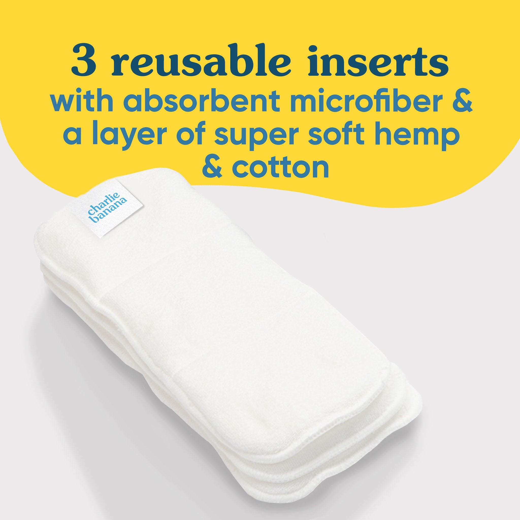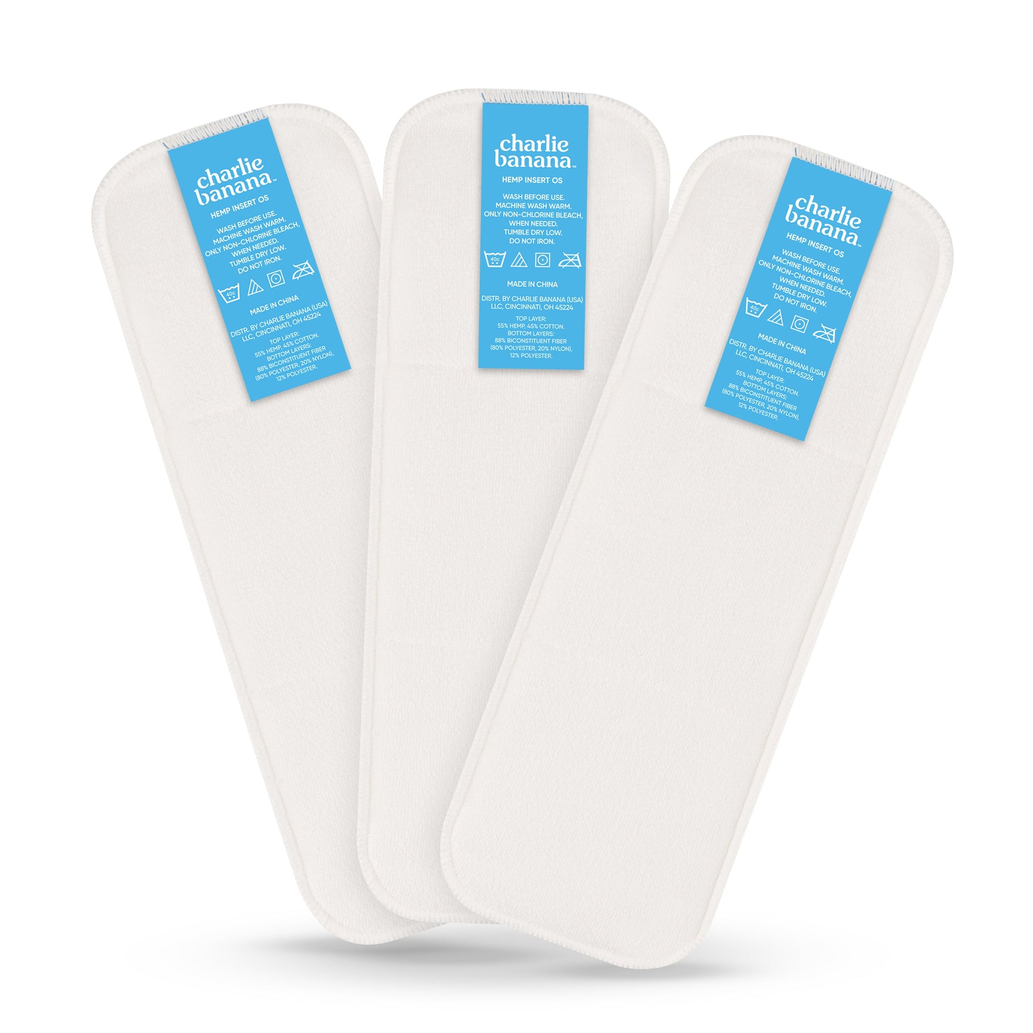 In the box, you'll find three one-size reusable hemp inserts to use in your Charlie Banana diaper. Double up with two inserts for extra protection or pair with a booster insert for less bulkiness.