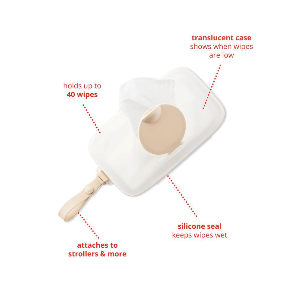 With a secure, wide opening and a moisture-stay seal, Skip Hop's baby wipes case is the answer to fresh wipes every time. Whether you drop it in your nappy bag or use the built-in strap to hang it on your stroller, it's the perfect, go-anywhere solution