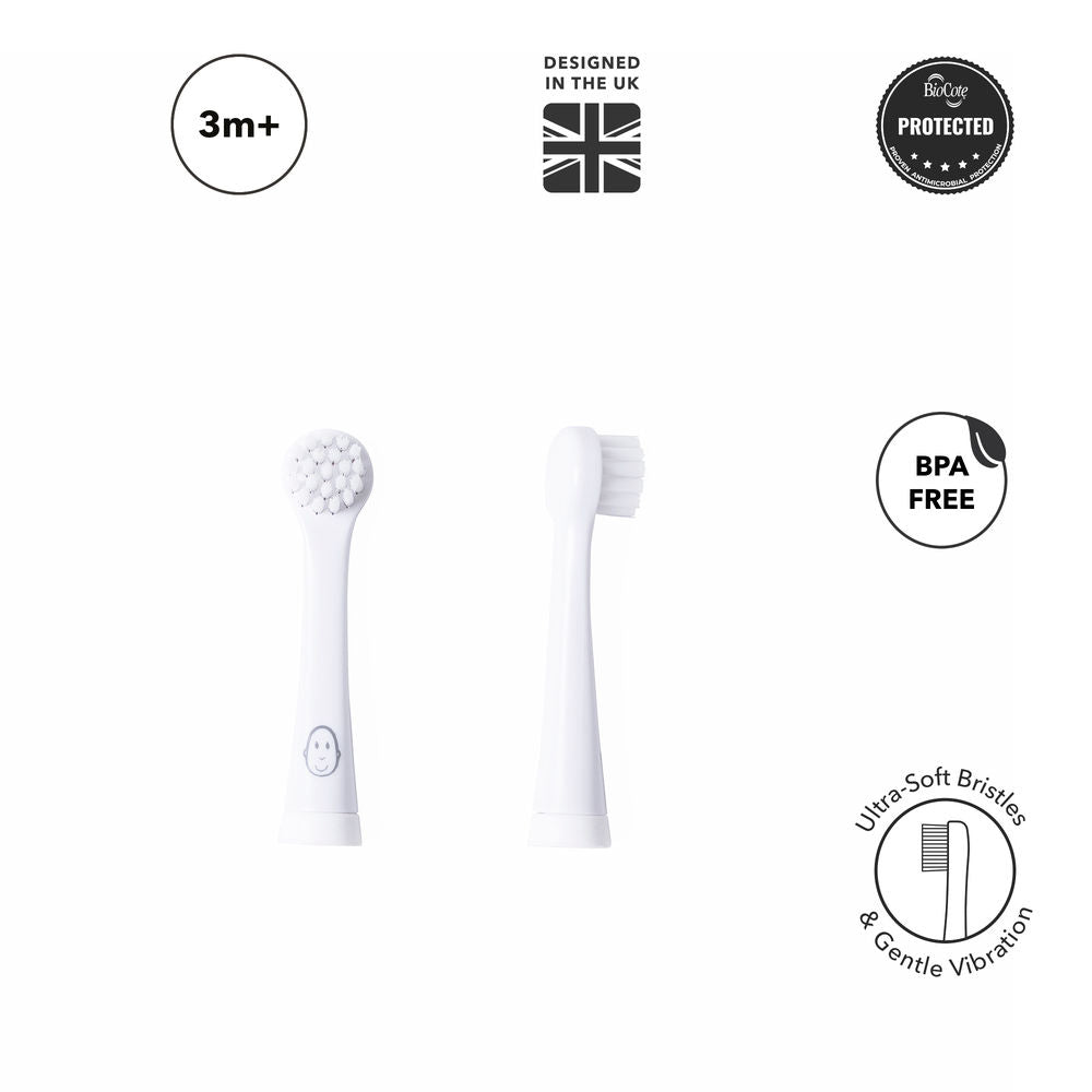 The baby sonic toothbrush has been designed to clean little one’s teeth gently and effectively. The two replacement heads can be used from 3-36 months have ultra-soft bristles that are extra gentle to babies newly cut teeth. They contain integrated BioCote® antimicrobial protection, which reduces the growth of microbes by up to 99.9% and keeps the toothbrush cleaner and fresher for longer