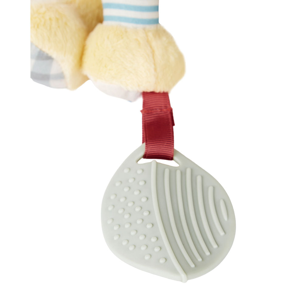 A soft toy and teether toy filled with textures, patterns and sounds! Little hands stay active as baby explores rattles, crinkles and more. This colourful character’s soft bandana teether toy detaches for mum to wear around her wrist for quick access. Perfect for multi-sensory play, this cute companion is ideal for fun at home or-on-the-go