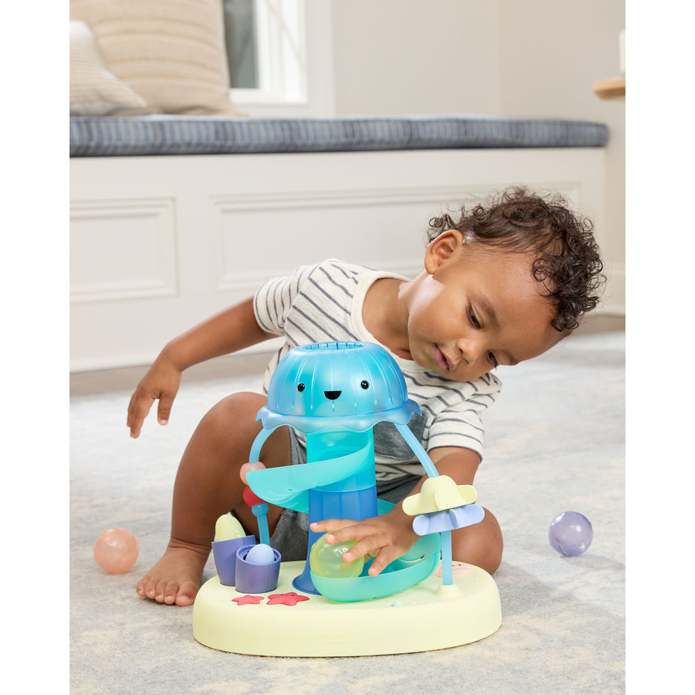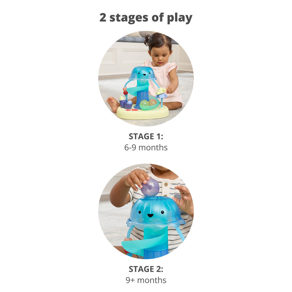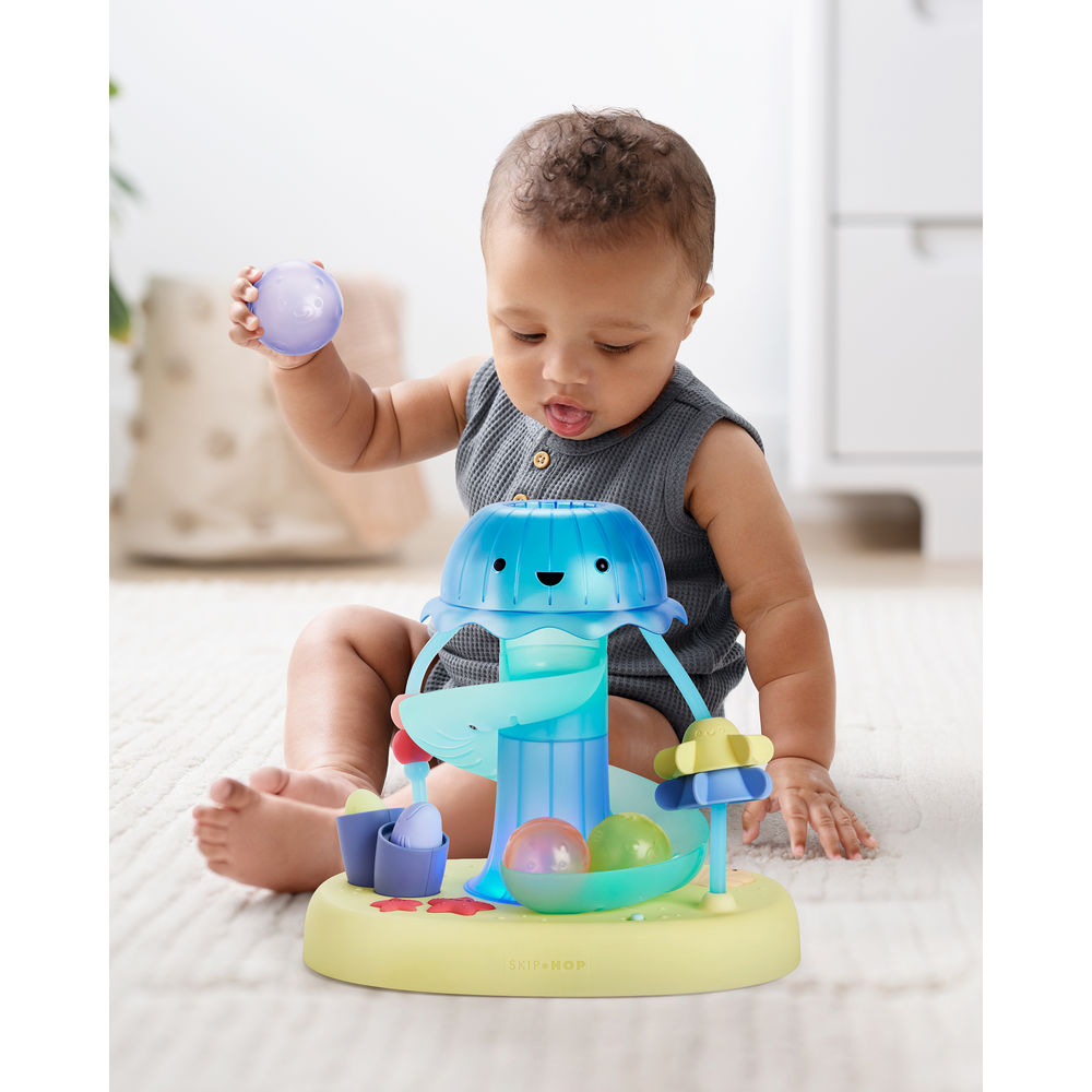 Introduce baby to sea-worthy exploration with Skip Hop's action-packed ball drop toy for baby and toddlers. Featuring two stages of play, this light-up jellyfish ball tower includes sea-inspired activities that encourage grasping, motor skills and hand-eye coordination. As baby grows and develops, they will love to drop the pufferfish balls down the spiral slide for rewarding lights, music and sounds—a fun intro to cause and effect